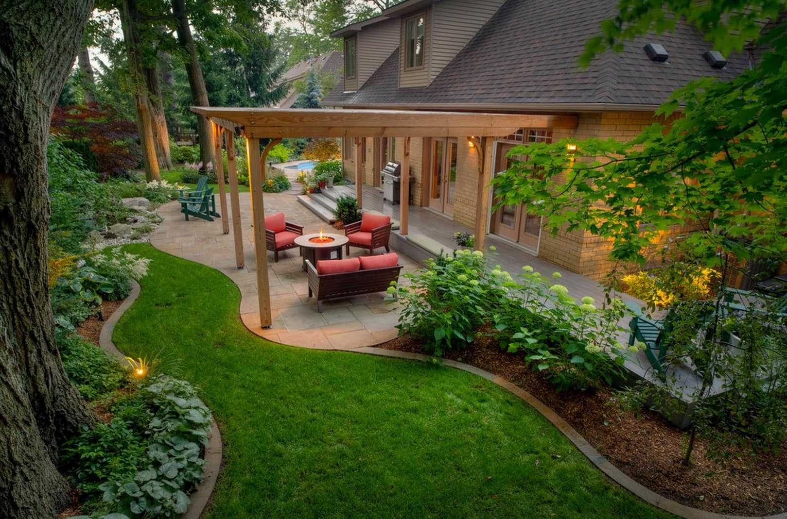 В зонировании участка также применяются различные арки и перголы. Они используются в качестве опор для лиановидных растений, стебель которых не обладает устойчивостью и нуждается в поддержке. Поставить перголу можно и как отдельный декоративный элемент на открытом газоне.