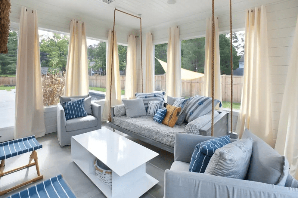Подумайте, что вам может потребоваться для создания приятного вечера, и обязательно организуйте это в своей гостиной на веранде. Возможно, вы всегда мечтали о гамаке или подвесном кресле-коконе. Так почему бы и нет? Лишь бы крепления были надежными. Не забывайте про озеленение веранды. Она хоть и служит связующим элементом между садом и домом, и позволяет наблюдать все прелести вашего ландшафтного дизайна из удобного кресла, свежие срезанные цветы в вазе не помешают. На открытых верандах уместными будут напольные горшки крупных размеров с цветущими растениями. Можно развесить по периметру горшки с цветущими петуниями или другими цветами.