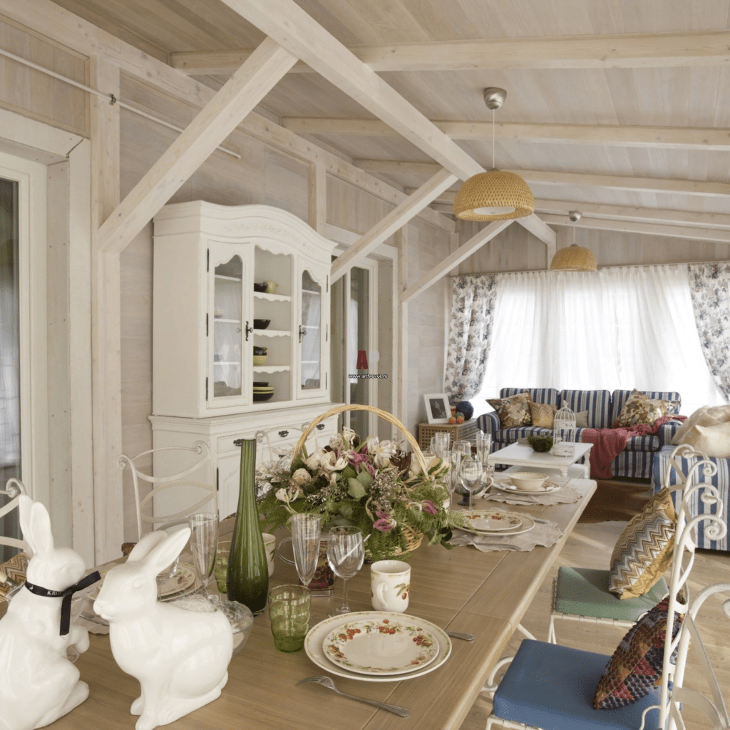 Для стиля кантри характерно использование преимущественно дерева. Оно стильно сочетается с ажурными салфетками, вышитыми скатертями и большим количеством свободного пространства.