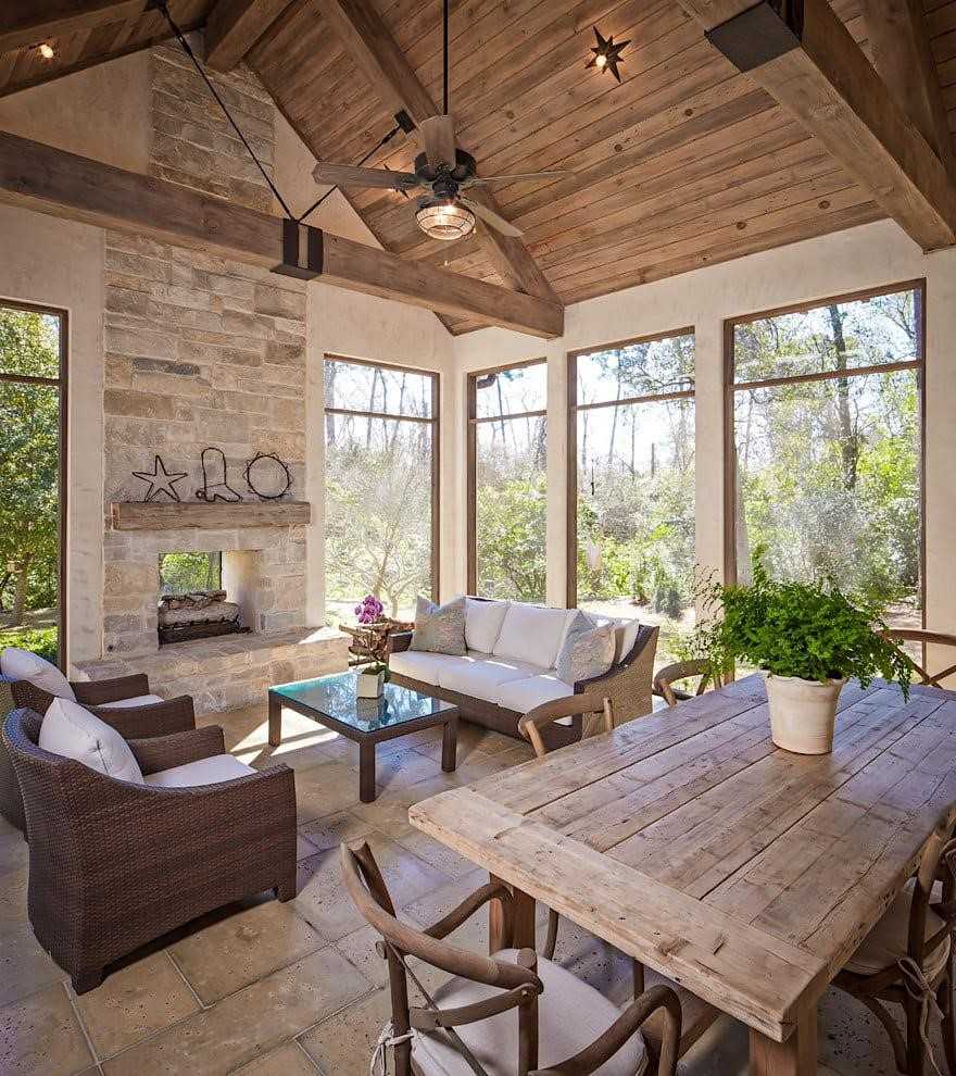 Чтобы выдержать веранду в едином стиле, необходимо использовать несколько элементов, задающих тон всему интерьеру. Так, камин из кирпича и каменные плиты пола в сочетании с деревянной кровлей укажут на эко-стиль вашего помещения. Такая стилистика подходит для людей любого возраста, чья душа стремится к естественности и природе.