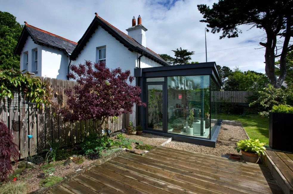 - Красивый ландшафтный дизайн в современном стиле отменно дополнит куб из стекла. Лучше использовать каленый или ламинированный материал. Этот вариант самый надежный в плане защиты веранды от пыли, грязи, ветра и дождя.