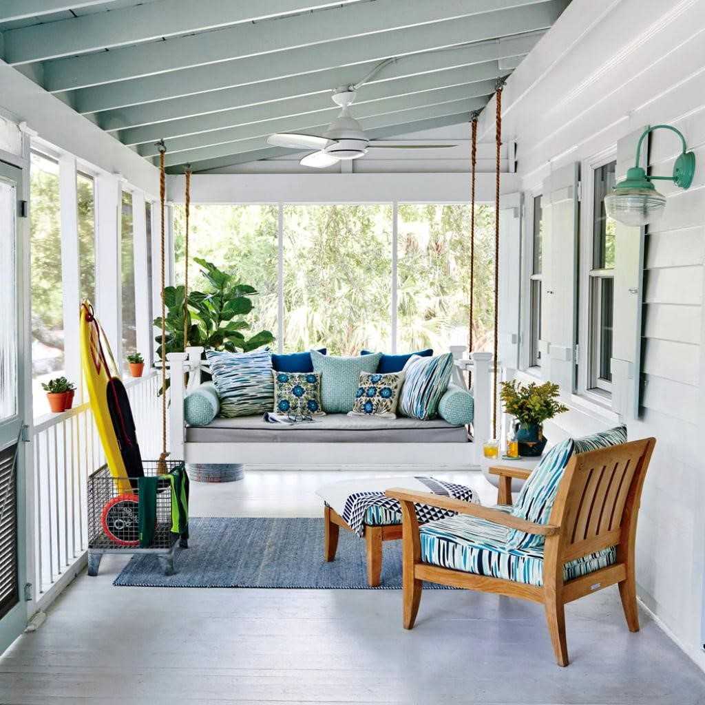 Чтобы выполнить веранду в средиземноморском стиле, не нужно строить ее на берегу моря. Соответствующая цветовая гамма и элементы декора привнесут морскую струю в ваше пространство.
