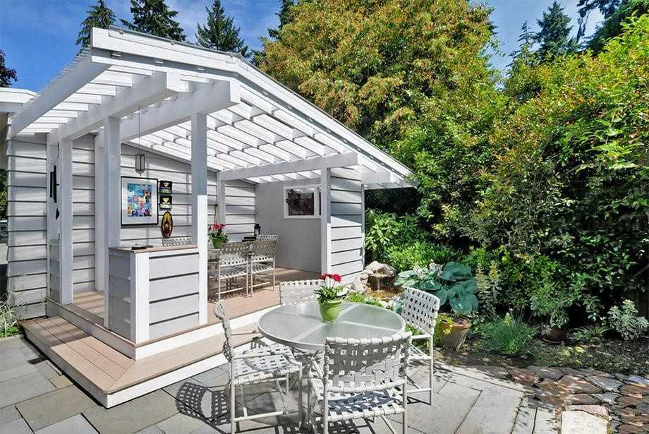 Выполненная в светлых тонах деревянная постройка сделает ваш участок легким и воздушным.