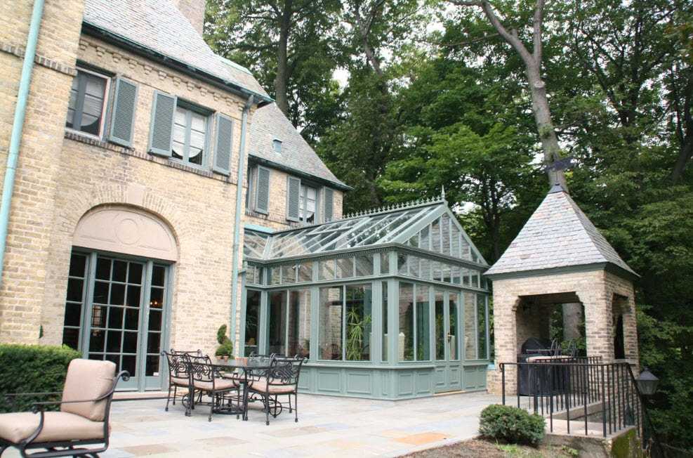 Такой вариант зимнего сада пристраивают к главному входу дома. За счет этого он является своеобразной переходной зоной между непосредственно улицей и жилым помещением. Данный вариант предполагает, что сад будет использоваться только в теплое время года, поэтому зачастую система отопления не устанавливается. Но при желании можно немного изменить проект, что позволит использовать сад круглый год.