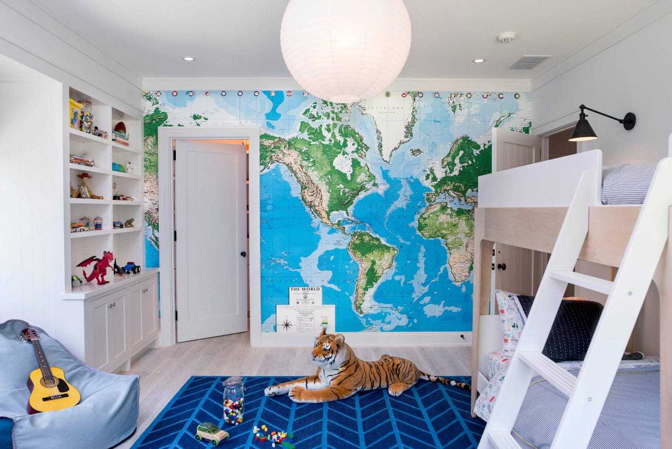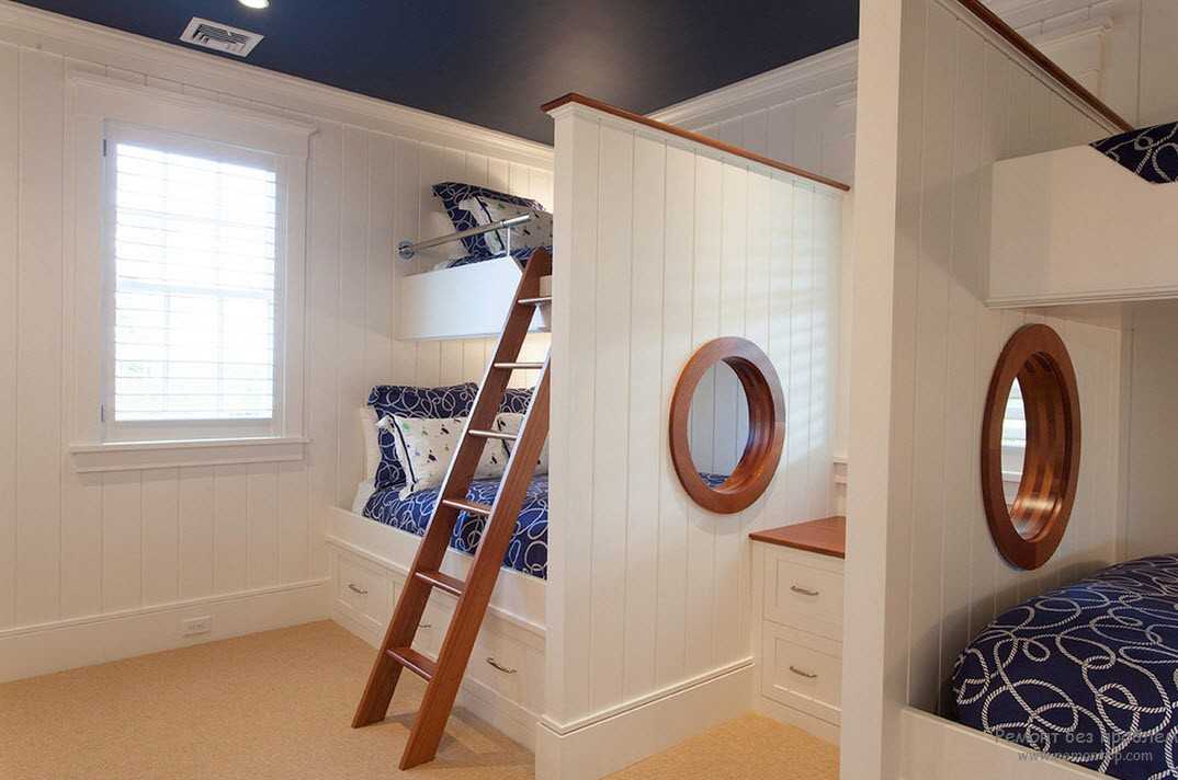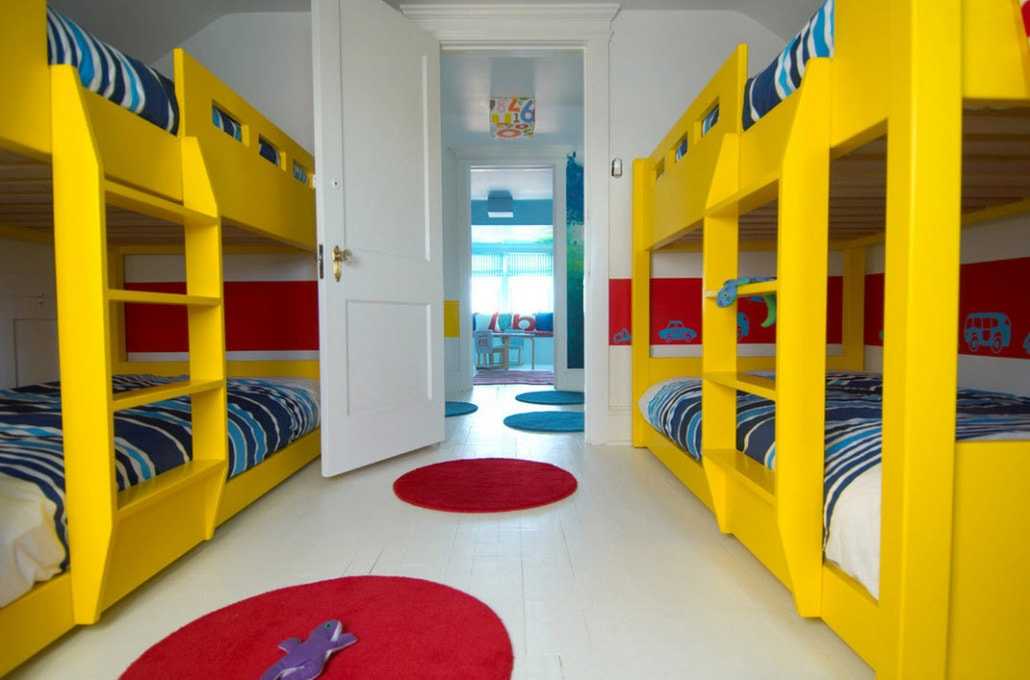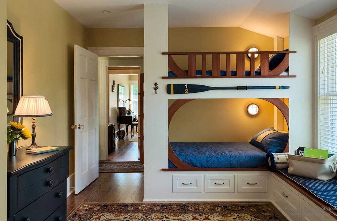 Интересный вариант оформления детской комнаты с двухъярусными кроватями немного напоминает иллюстрацию из фильма. В такой комнате обязательно захотят находиться как мальчишки, так и девчонки.