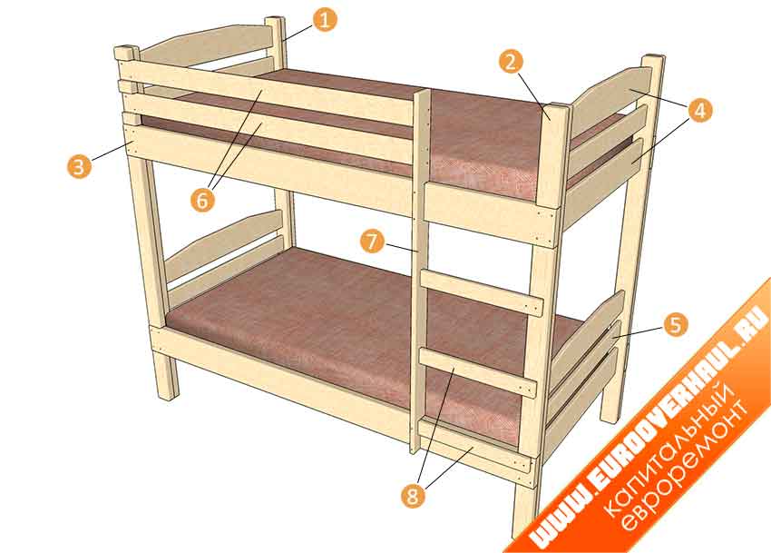 1 — вертикальные стойки (ножки); 2 — внешние накладки на стойки; 3 — доски несущей рамы; 4 — верхние и нижние планки изголовья; 5 — центральная планка изголовья; 6 — боковые ограждения; 7 — перила лестницы; 8 — ступени лестницы.