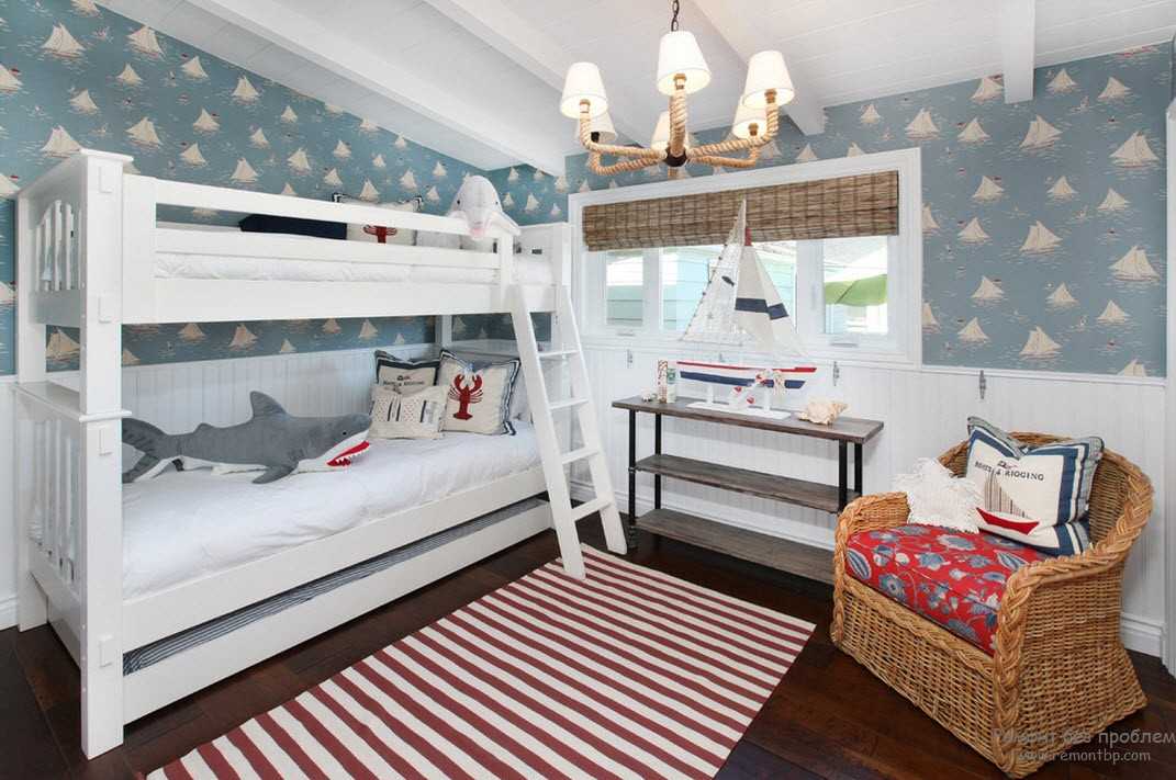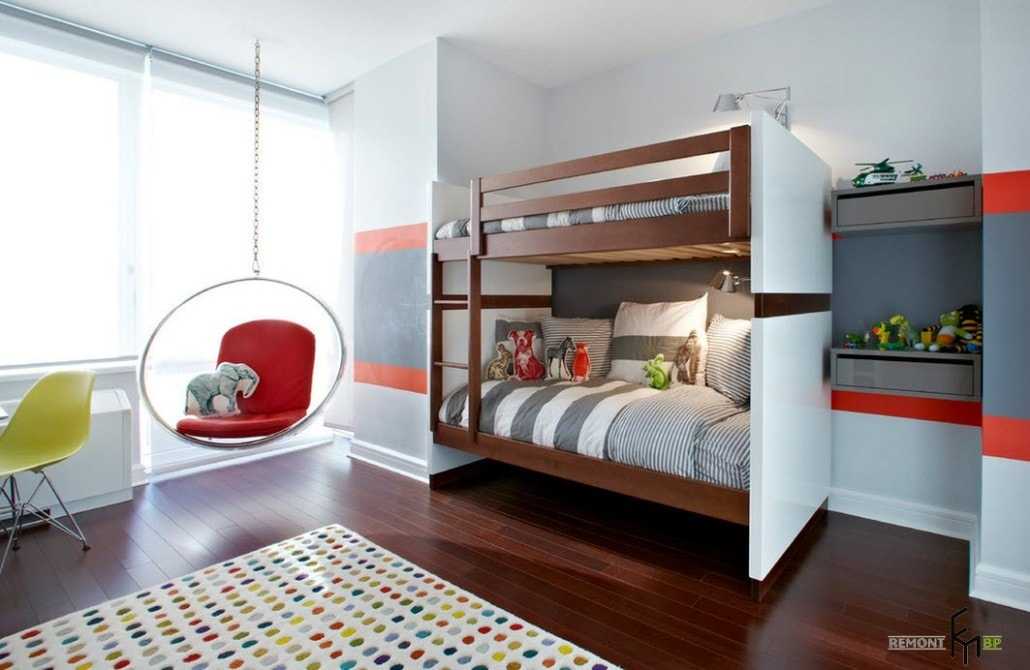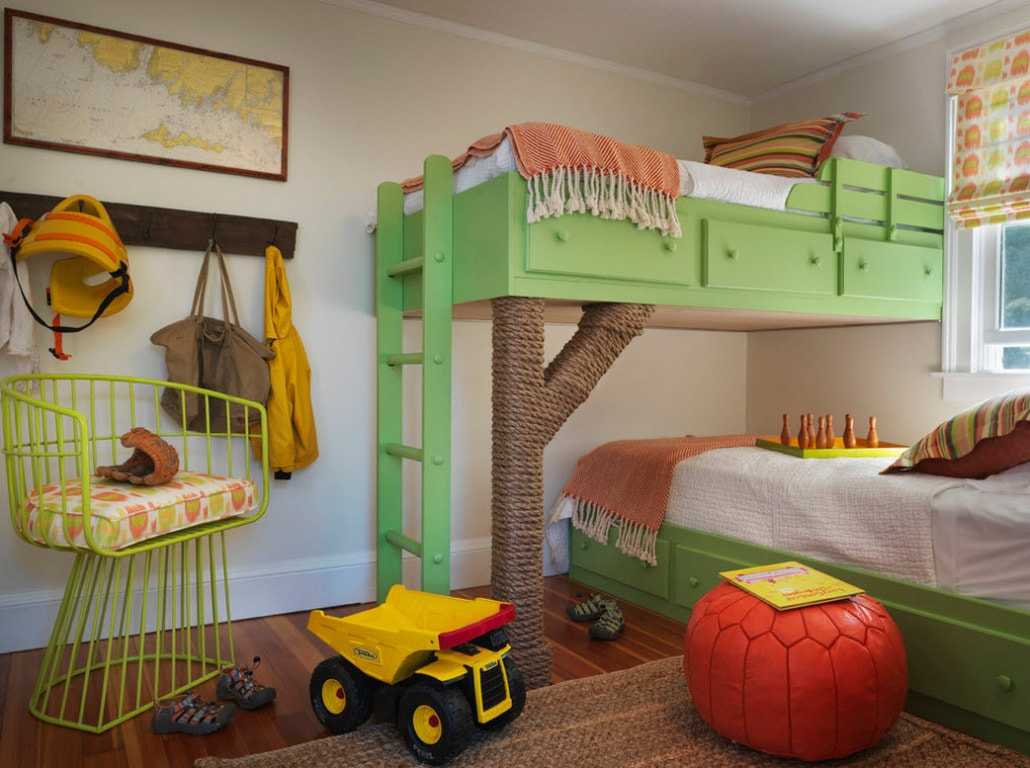 Что здесь может быть особенного? Стоит обратиться к тематическому дизайну: двухъярусная кровать может быть сделана в виде машины, корабля или поезда, что наверняка вызовет восхищение обоих будущих мужчин. Еще можно выбрать модель с горкой или канатом (спортивный стиль).