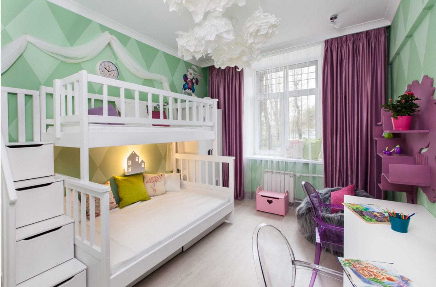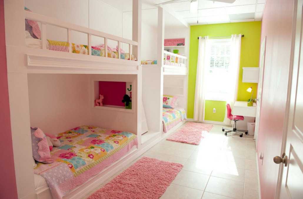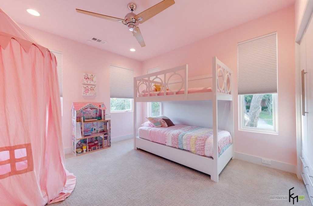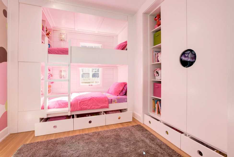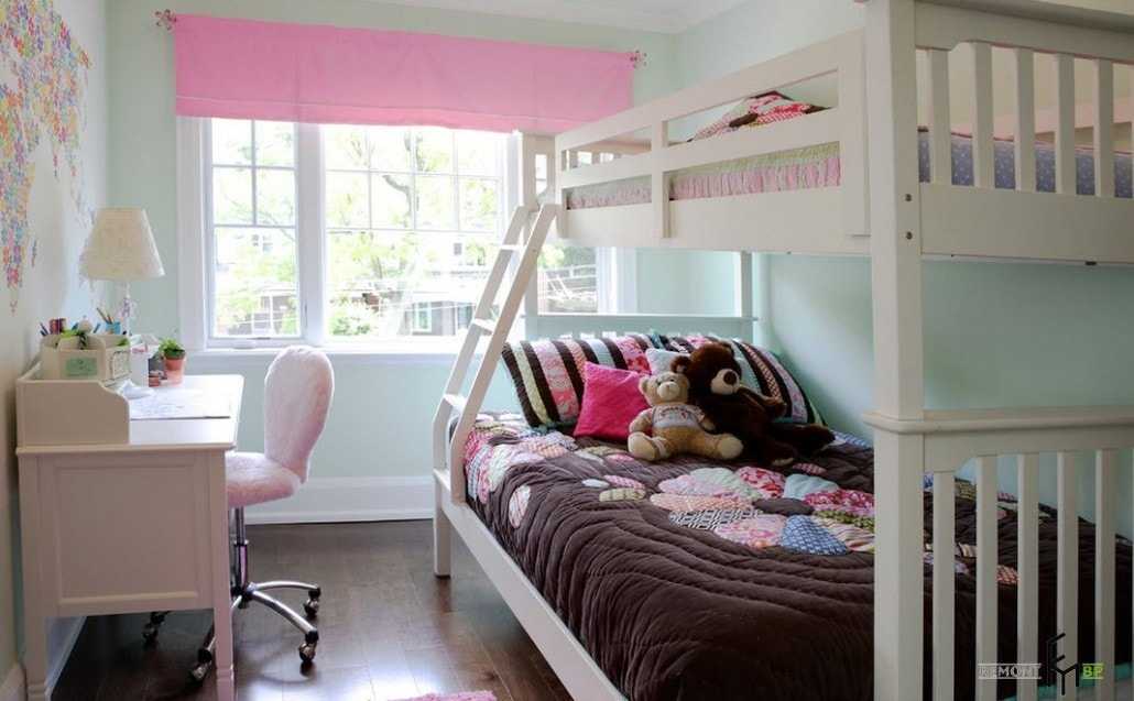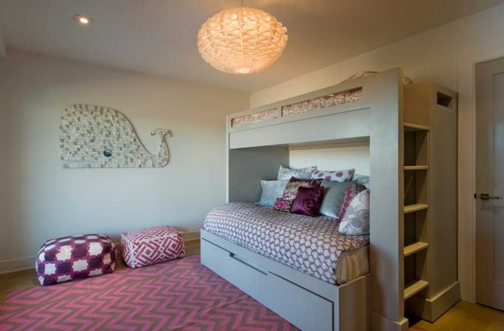 Здесь дизайн совершенно иной, особенно в плане выбора цвета. Он должен быть мягким: предпочтение рекомендуется отдавать пастельным оттенкам. Сама конструкция может быть оформлена в виде небольшого домика, в торцах которого есть «окна». Внутри первого яруса на стене можно повесить рисунки девочек.
