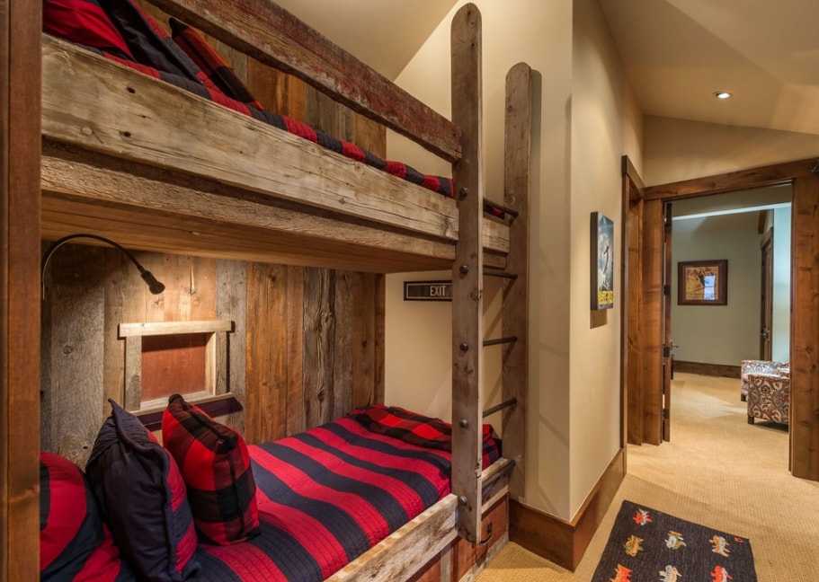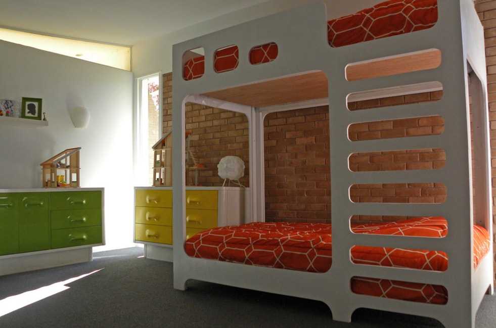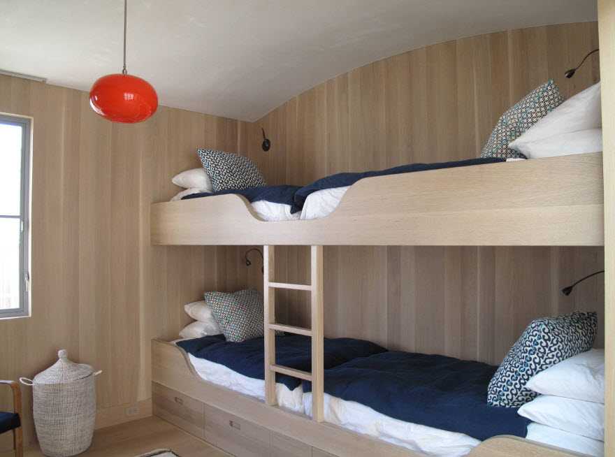 Стильно смотрятся двухъярусные кровати необычной формы. А детки и их друзья будут в восторге от такой идеи.