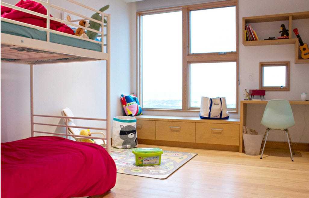 Иногда «первый этаж» применяется для расположения комодов, ящиков с игрушками, которые могут прятаться и в ступенях лестницы, часто можно встретить двухъярусные кровати со шкафом и ящиками. Такая модель практически полностью разрешает проблему меблировки детской, позволяя отдать все остальное пространство комнаты под игровую зону.