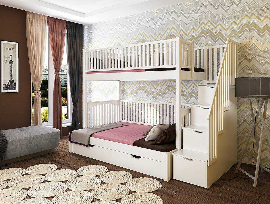 Это тоже непростой вариант. Но здесь хотя бы можно попросить старшего ребенка уступить младшему. Тип конструкции двухъярусной кровати может быть любым: классическим, со смещением в сторону или перпендикулярным. На верхнем ярусе обычно спит старший ребенок: ему интересно пользоваться лестницей (она может быть встроенной), которая для младшего представляет опасность.