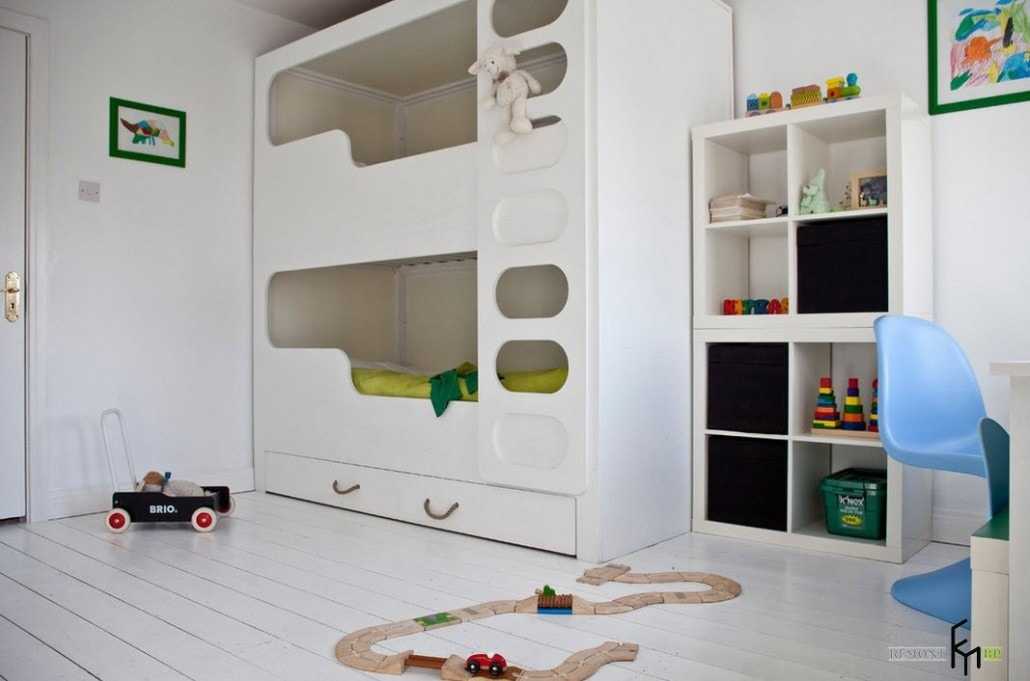 - Низ кровати – система хранения. В этом случае нижний «этаж» полностью предназначается для игрушек и иных предметов, располагаемых в шкафах и комодах.