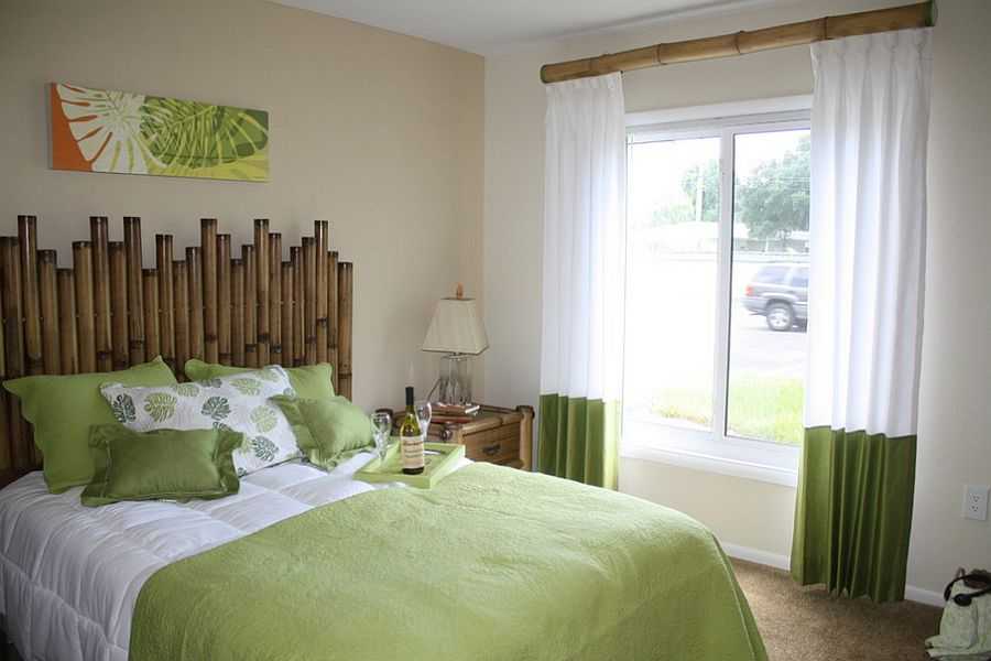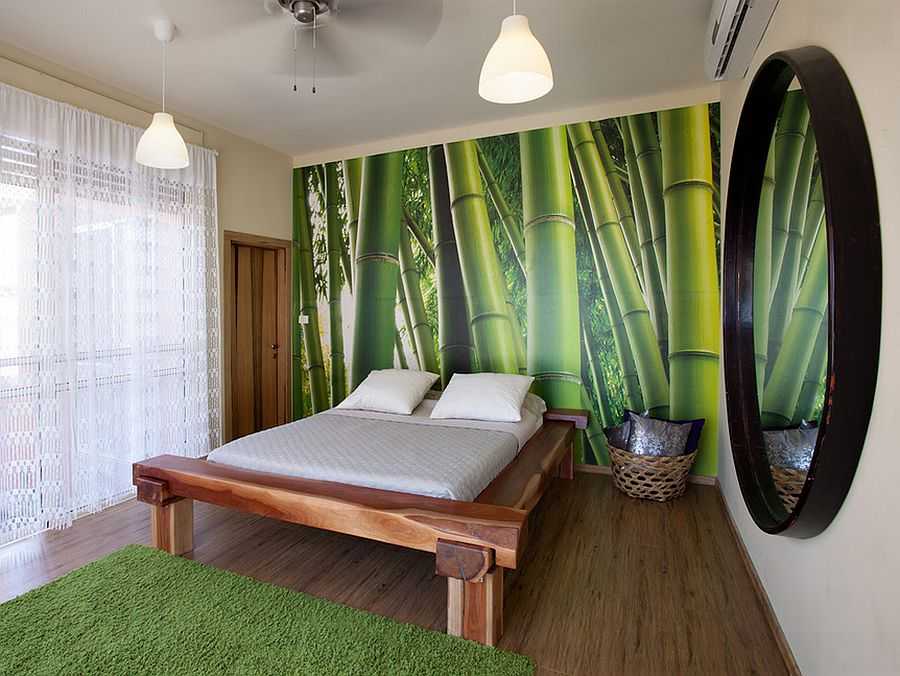 Если вы не можете позволить себе бамбуковую кровать, используйте фактурные стебли в качестве креативного изголовья. Крайне оригинально эти изделия будут выглядеть на фоне стены с фотообоями зелёного растения.