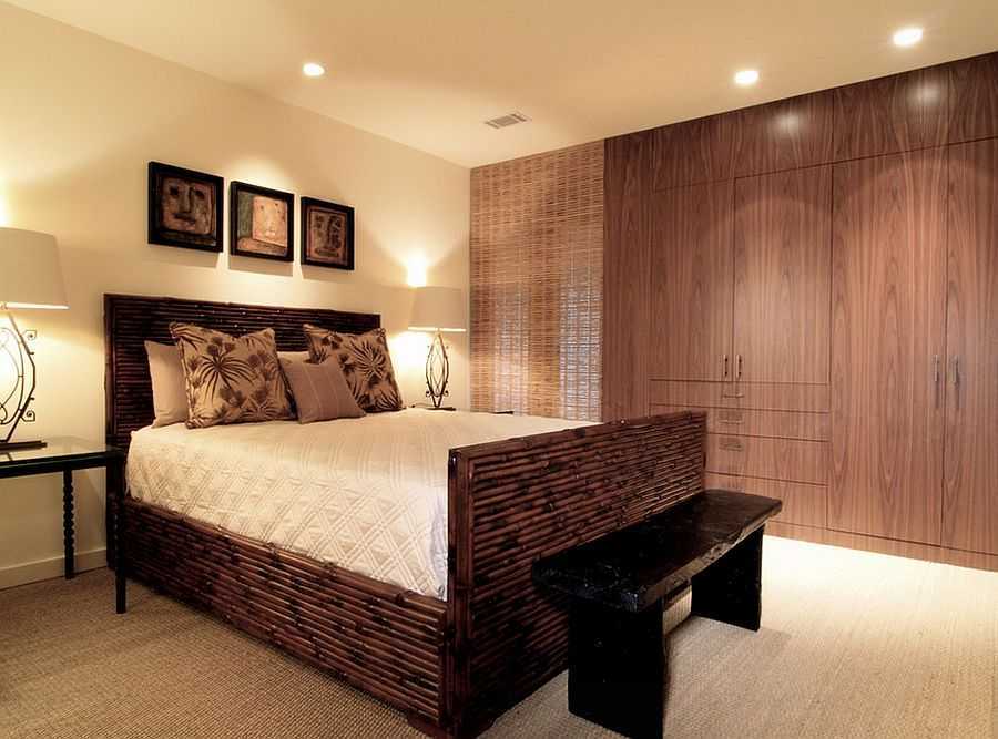 Стена из бамбука за изголовьем кровати