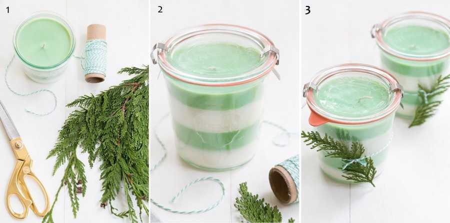 Украсьте емкость со свечой веточкой розмарина или туи.