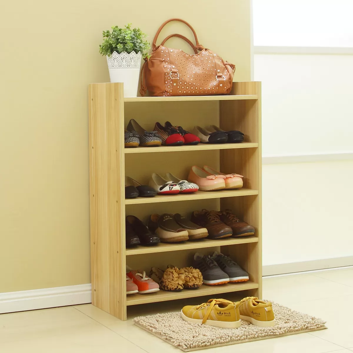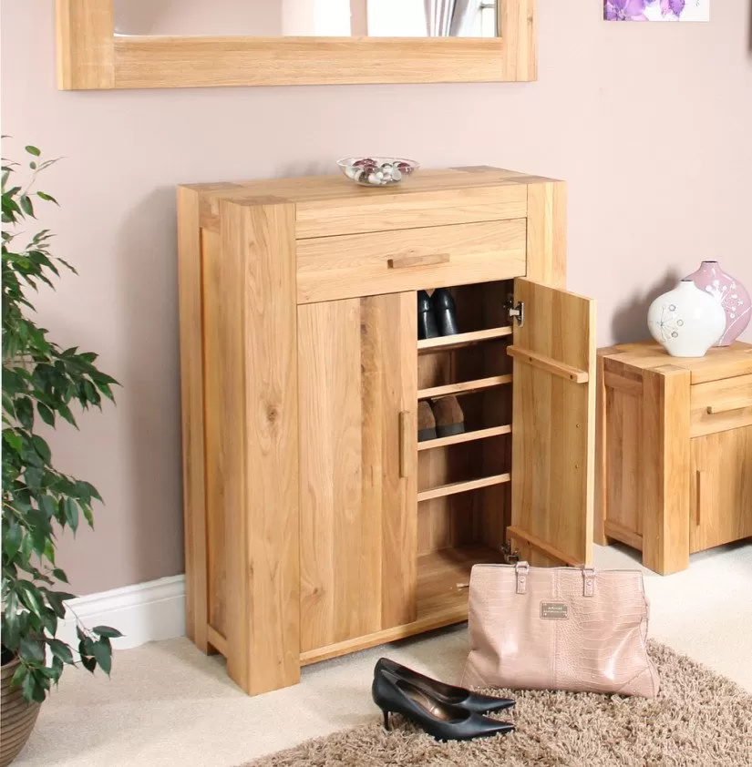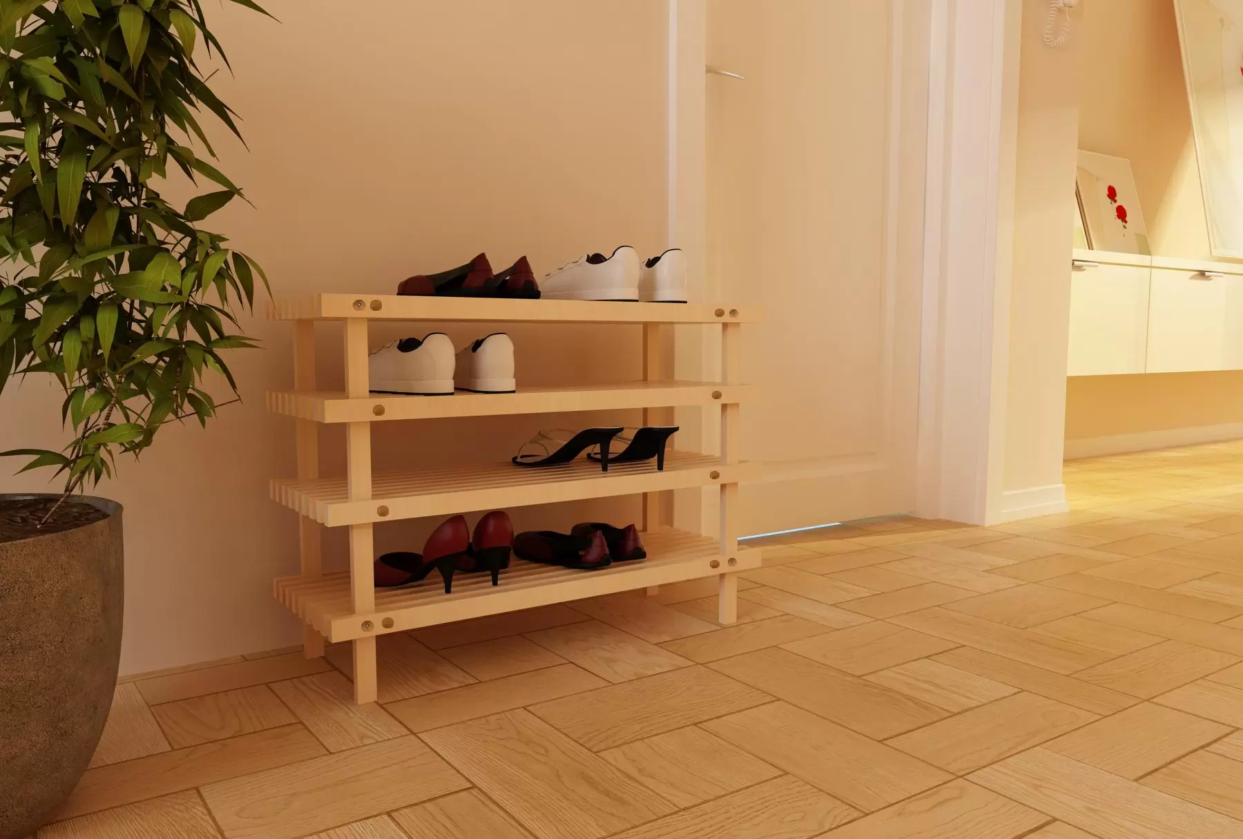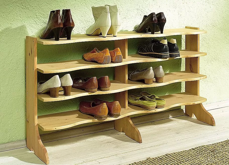 Для обуви чаще используются напольные, изготовленные из дерева: обработанная доска, фанера или панели. Размер рассчитывают исходя из доступного пространства в прихожей и количество пар обуви, которые будут стоять на полке.