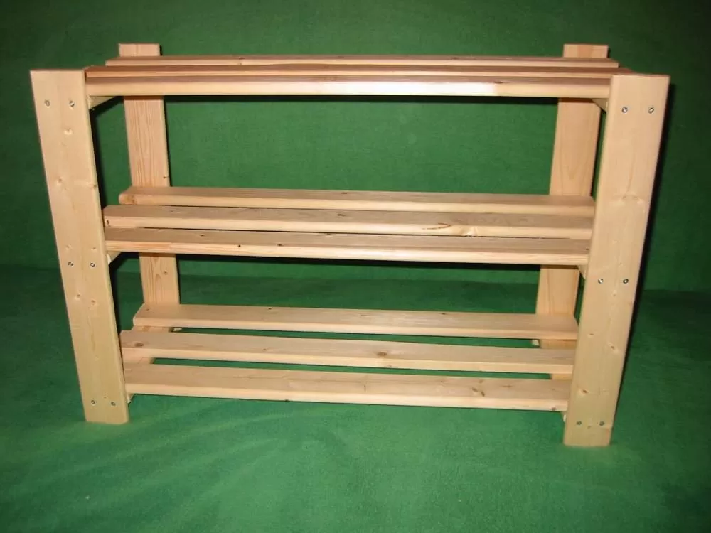 - Первый этап ─ выбор основания, если конструкция его предусматривает. Для него берут доску с толщиной не менее 3 см. При подборе длины учитывают, что по бокам основания необходимо установить вертикальные стенки. Снизу следует прибить продольные доски шириной 50–70 мм, а между ними поперечины, чтобы стеллаж стал прочным.