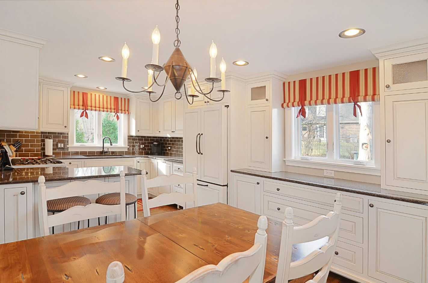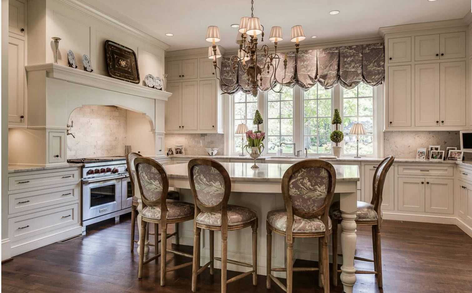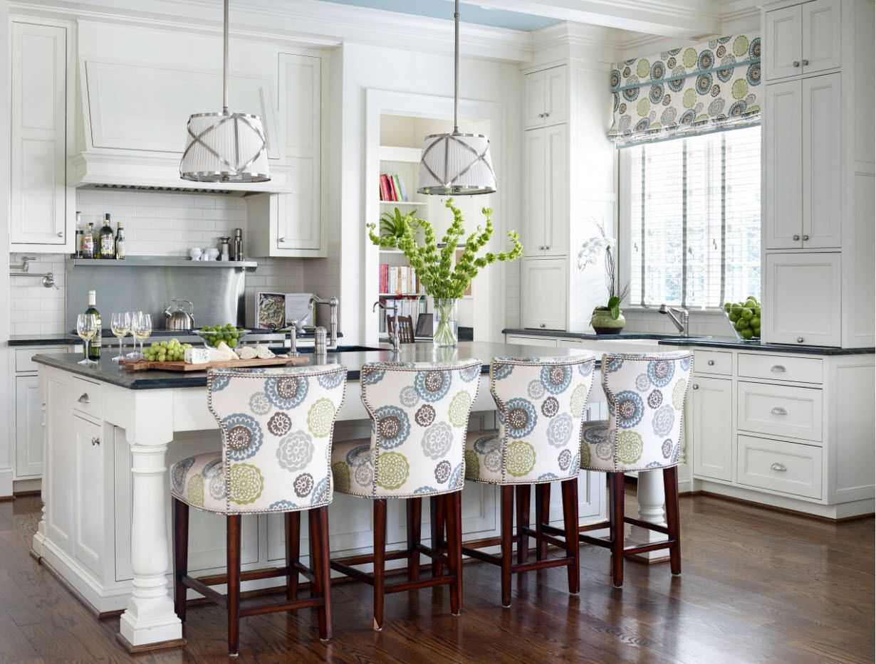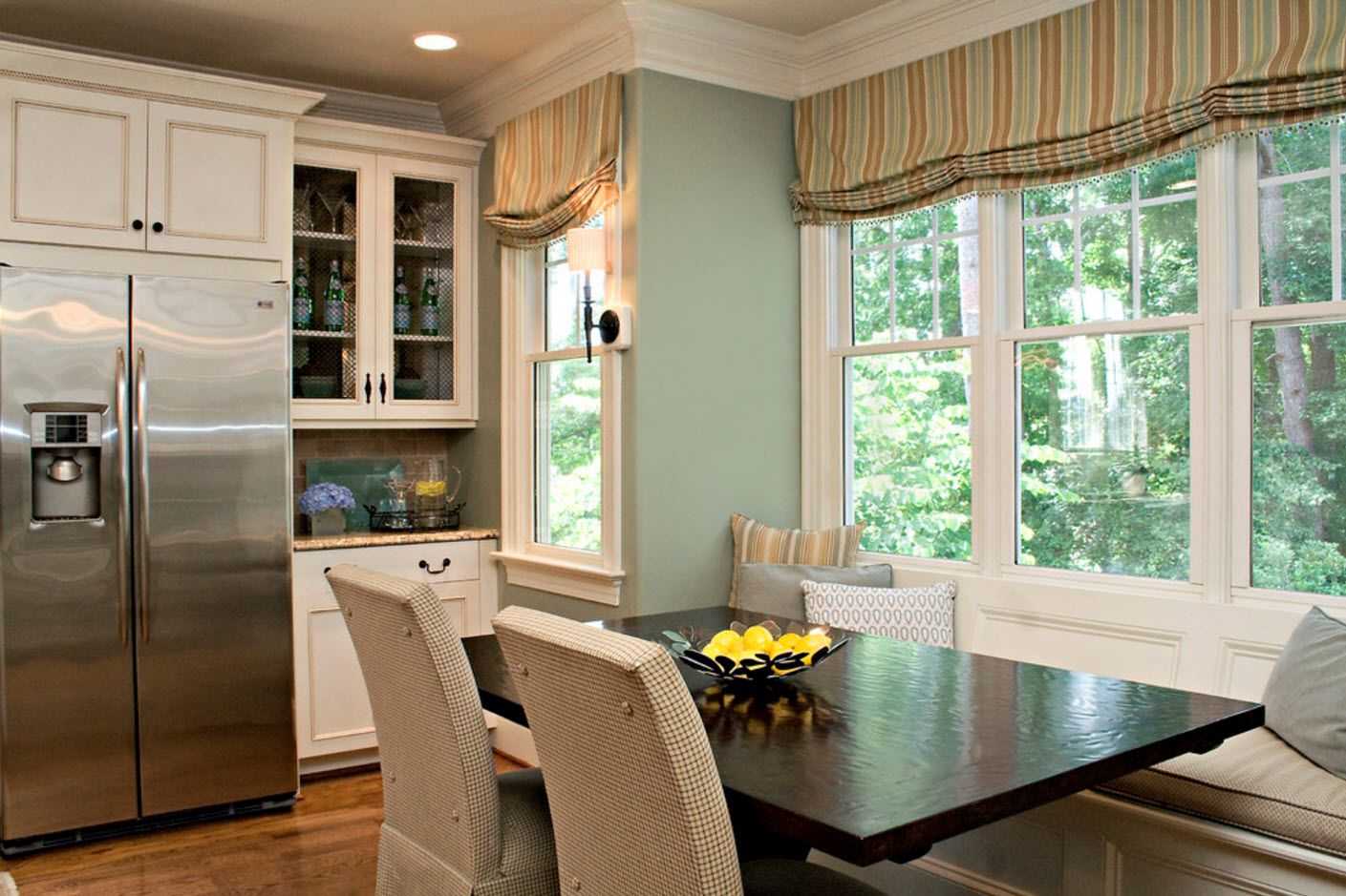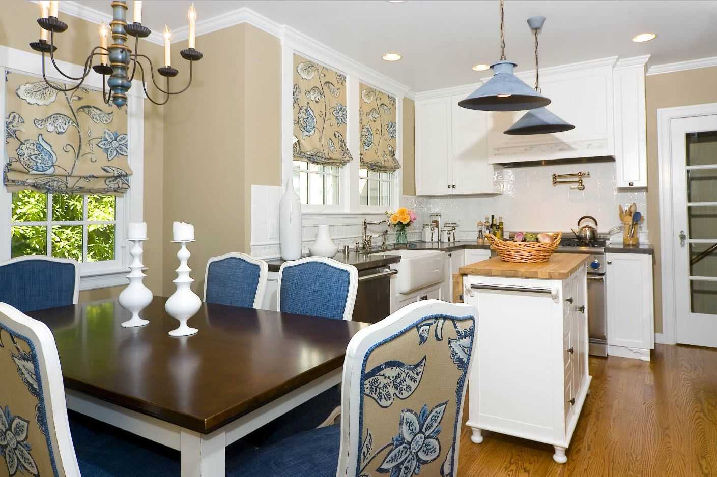 цветовой гаммы помещения – тона стен и фасадов кухонного гарнитура; вашего желания сделать оформление кона незаметным, гармонично вливающимся в общую картину интерьера или акцентным, привлекающим внимание; если ткань штор будет с рисунком, то продублировать его можно в обивке стульев или табуретов (сиденья и спинки), оформлении обеденного стола (скатерть, дорожка, индивидуальные коврики или салфетки)