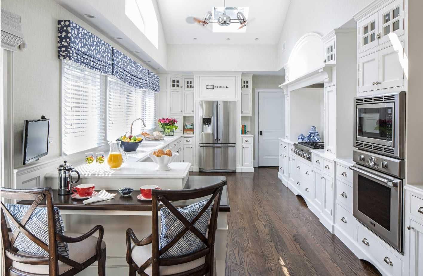 Популярны также геометрические и абстрактные принты. Все зависит от того, какого размера ваша кухня и в какой цветовой гамме она оформлена. В просторном помещении гораздо больше вариантов для маневра с крупным и ярким рисунком текстиля для окон. Но даже в небольшой кухне можно использовать ткань с орнаментом, рисунком, если отделка стен выполнена в светлом тоне и исполнение кухонных фасадов также не отличается яркостью.