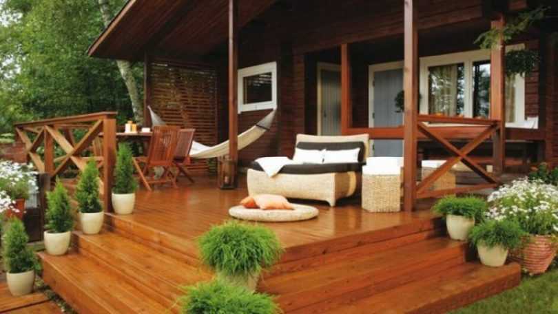 Более взвешенного подхода требует облицовка веранды открытого типа. Ее внутреннее пространство, даже несмотря на наличие крыши, будет подвержено воздействию абсолютно всех неблагоприятных факторов. Косые дожди запросто зальют пол, сильные морозные ветра будут обдувать постройку со всех сторон. Так как открытая веранда — это по сути лишь каркас без стен, это немного облегчает задачу. Конечно же, наиболее долговечным вариантом будет обустройство бетонного фундамента с последующей его облицовкой. Для этого подойдет песчаник или керамогранит, который является очень прочным и морозоустойчивым отделочным материалом. Если настил выполнен из деревянных брусьев, позаботьтесь о правильной обработке древесины перед монтажом. Это включает и обработка антисептическими свойствами и пропитка горячей олифой или покрытие несколькими слоями защитного лака.