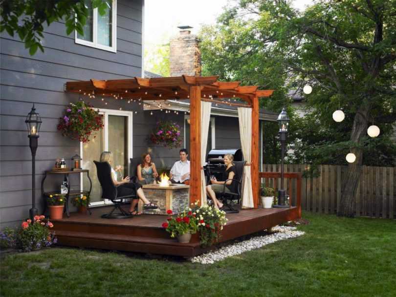 Не стоит забывать и про освещение. Вечером сделать обстановку уютной и теплой помогут высокие напольные торшеры с тканевыми абажурами. На открытом пространстве можно обойтись светильниками в виде уличных фонарей. Можно создать атмосферу праздника и повесить под крышей гирлянду.
