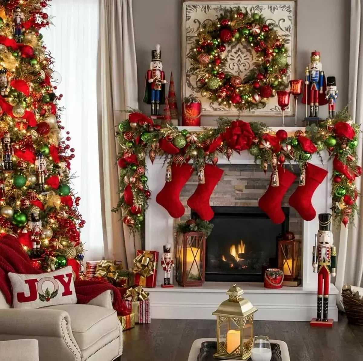 Камин сам по себе является мощным украшением современного интерьера. Традиционно его оформляют рождественскими носками, в которые попадет волшебный подарок от Деда Мороза.