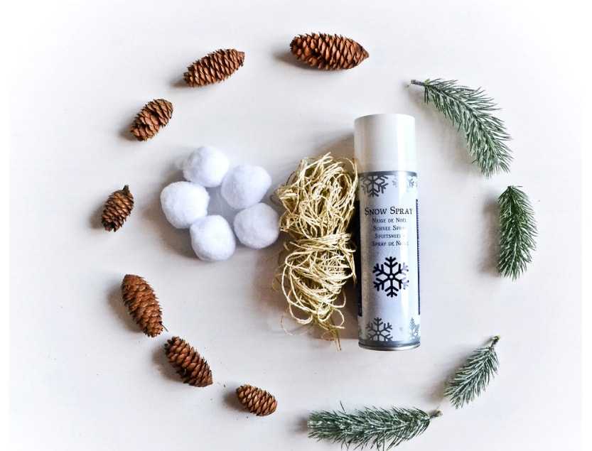 На месте соединений ленточек приклеиваем небольшие еловые веточки, располагая их по кругу, приклеиваем каждую клеем.
