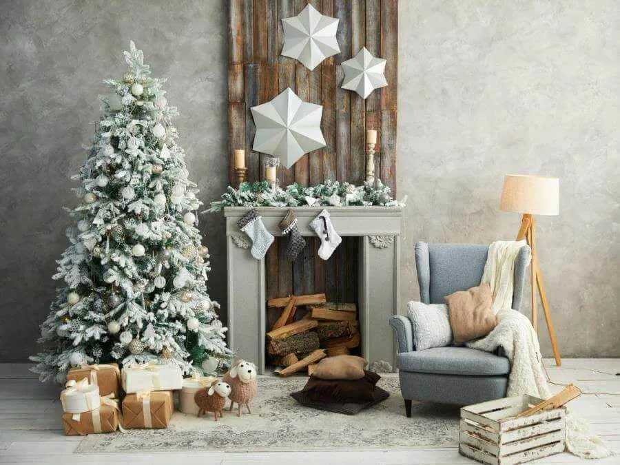 Гостиная – место, где можно вдоволь поэкспериментировать с новогодним дизайном. На фоне кирпичных и бетонных стен очень эффектно смотрятся украшения с оттенком металлик, серебро, золото.
