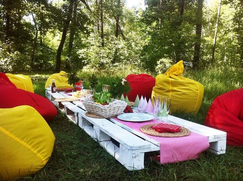 Праздничная обстановка – низкий стол из поддонов, окрашенный белой краской и разноцветные кресла-мешкиИсточник mrpallet.ru