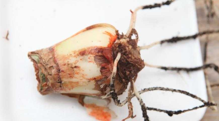 Луковицы выкапывают, очищают от отмерших поверхностных чешуи и остатков корней у донца. Живые мясистые белые корни нужно сохранить. Луковицы дезинфицируют в растворе марганцовки или фунгицида.