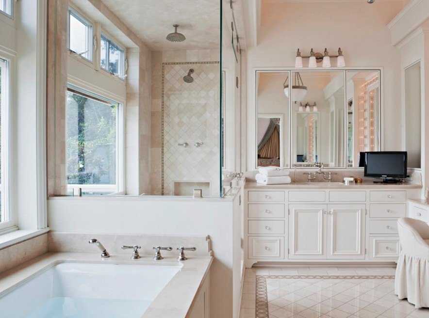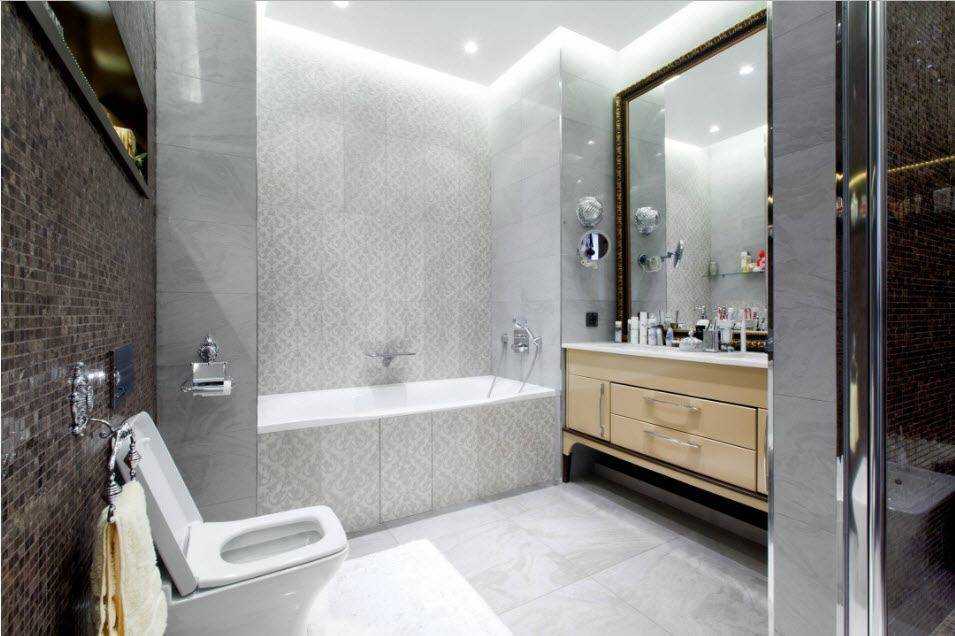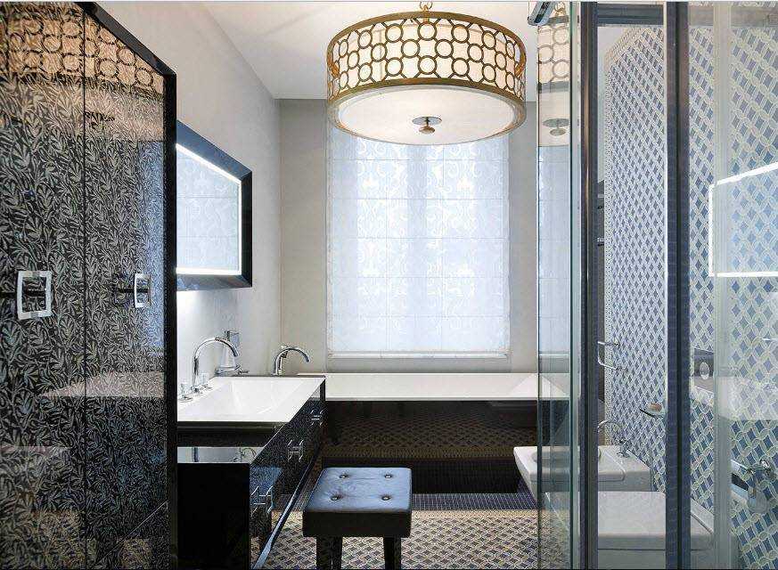 Как видно на фото, такой дизайн ванной комнаты обладает следующими чертами:
