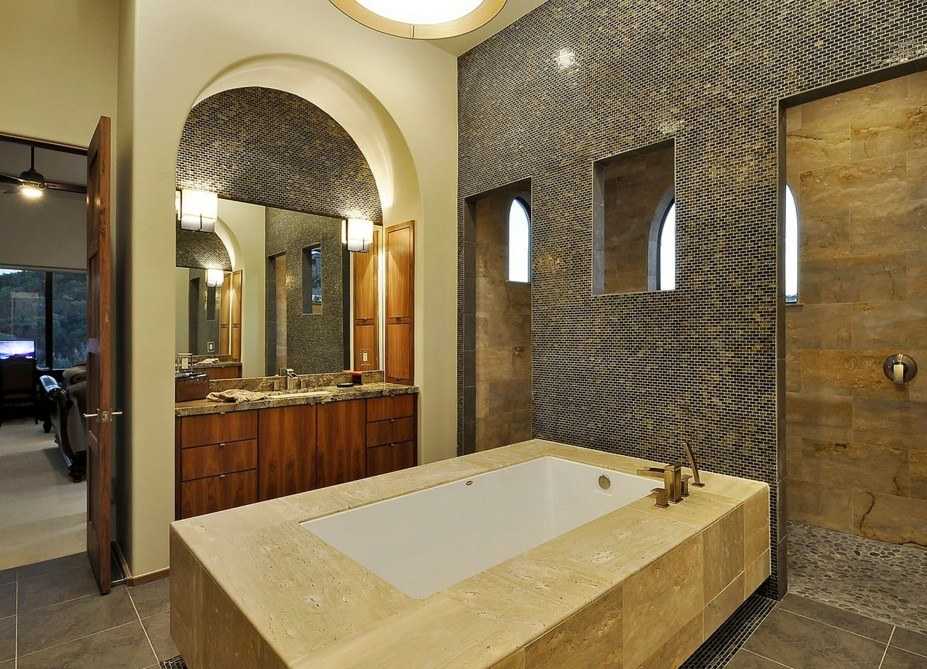 - Вокруг ванной делается подиум полукруглой формы, а уменьшенное за счет этого пространство компенсируется большим зеркалом. Этот дизайн ещё называют «без углов».