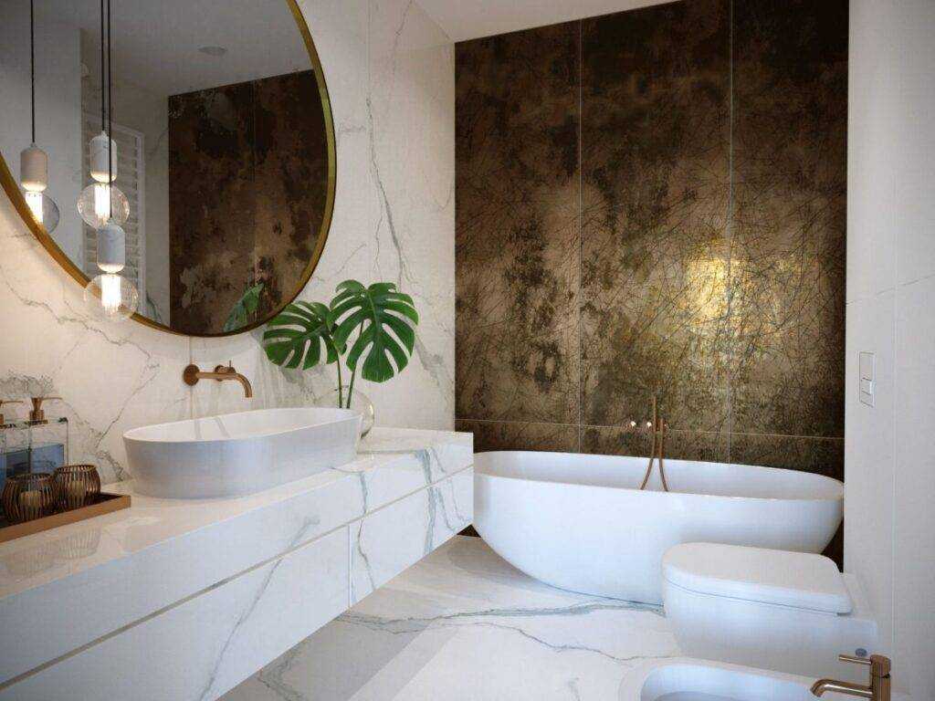 Еще один вид плитки для ванной, который обязательно будет громким в 2021 году — это настенная и напольная плитка с металлической отделкой. Их можно ввести в интерьер, выбрав модели с блестящей металлической поверхностью, плитку, украшенную элементами из металла (например, мраморную плитку с золотыми прожилками) или трехмерную плитку с фактурным рисунком листа.