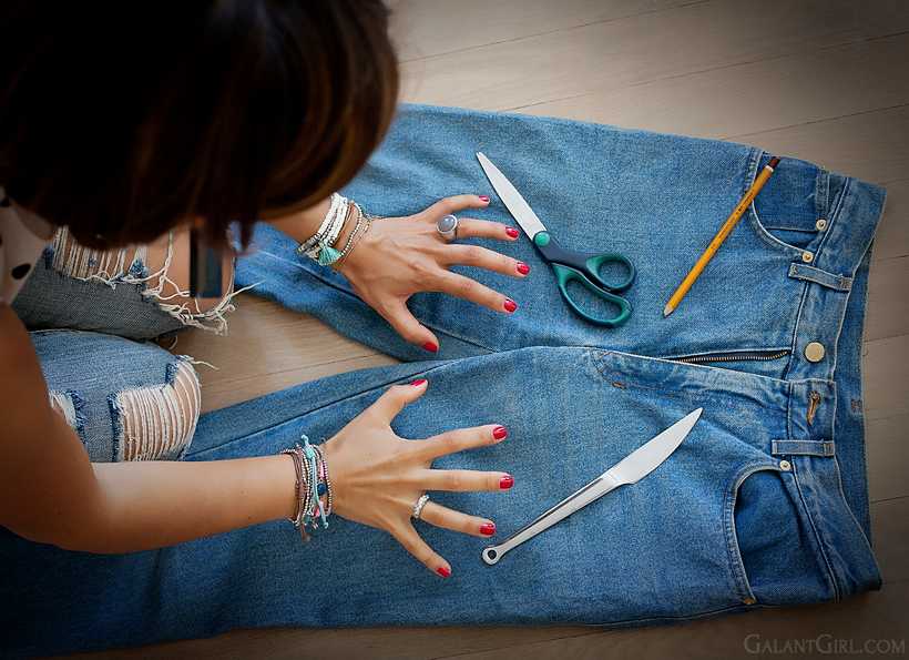 - срезы денима обработать наждачной бумагой — движения должны быть трущими и очень аккуратными, чтобы не повредить нити, а просто вытянуть их из ткани;
