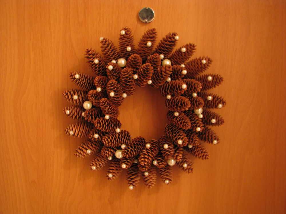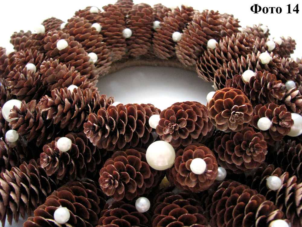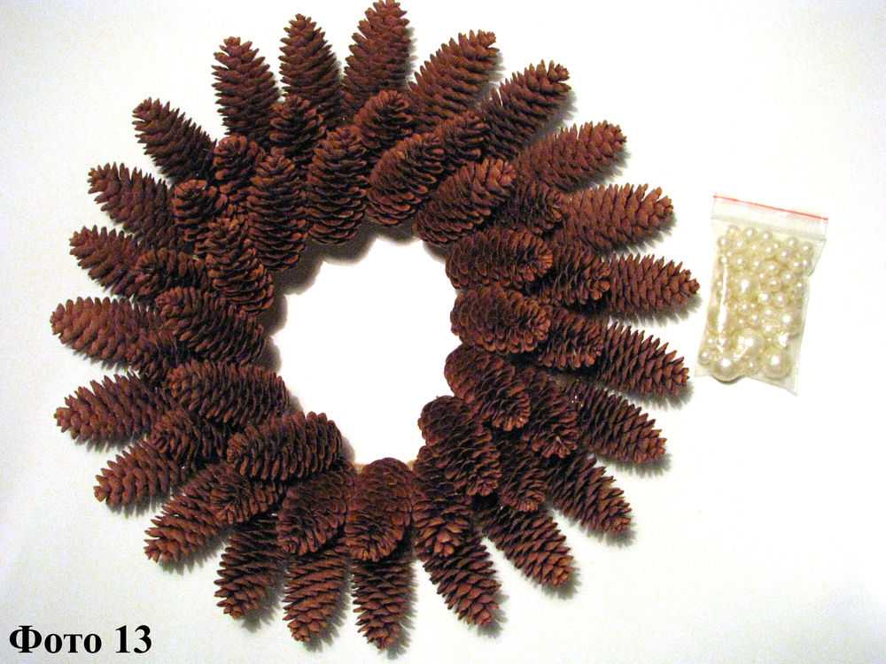 Следующий вариант оформления венка больше соответствует модным тенденциям. Все потому, что для него используется натуральный материал, а именно шишки.