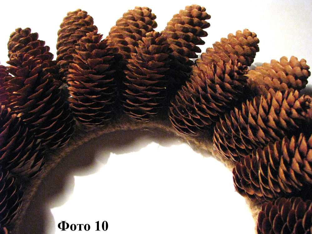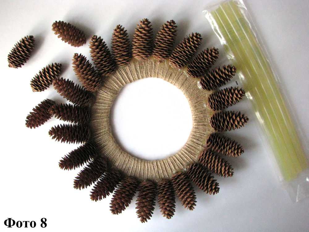 Очень важно, чтобы между нитями не возникли промежутки, через которые слишком заметен картон. Чтобы добиться такого эффекта лучше у внутреннего кольца немного накладывать нити друг на друга. Закрепляем шишки у внешнего круга основы, используя клеевой пистолет