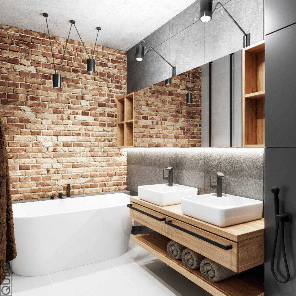 Черная мебель для ванной в индустриальном стиле — стальная мебель отлично впишется в такой дизайн, облицованный серой плиткой или красным кирпичом.