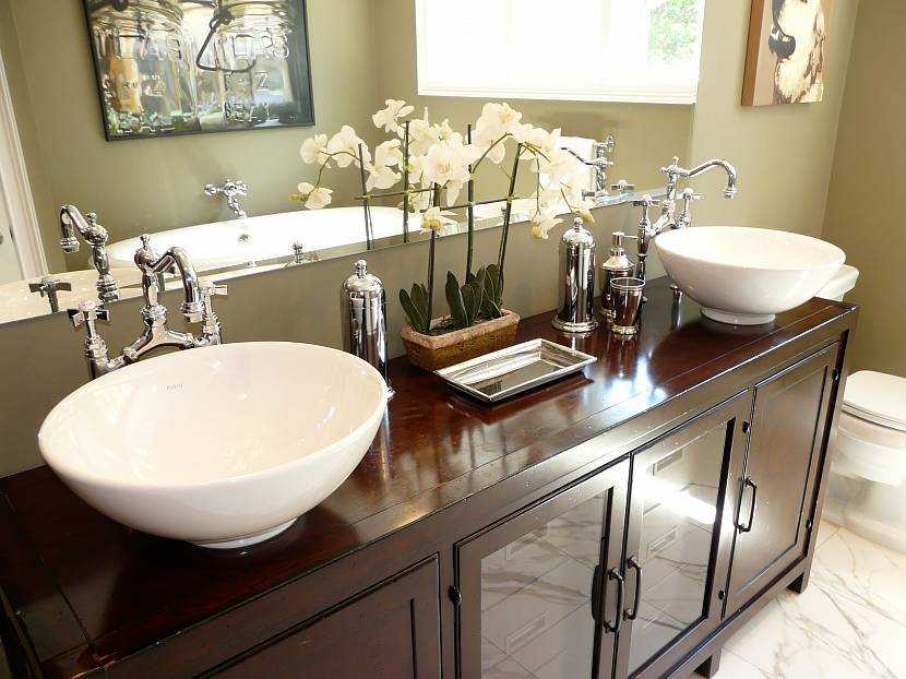 Стекло устойчиво к влаге и другим повреждениям, что особенно важно для конструкций в ванной комнате. Черная мебель из дерева — это более классическое решение