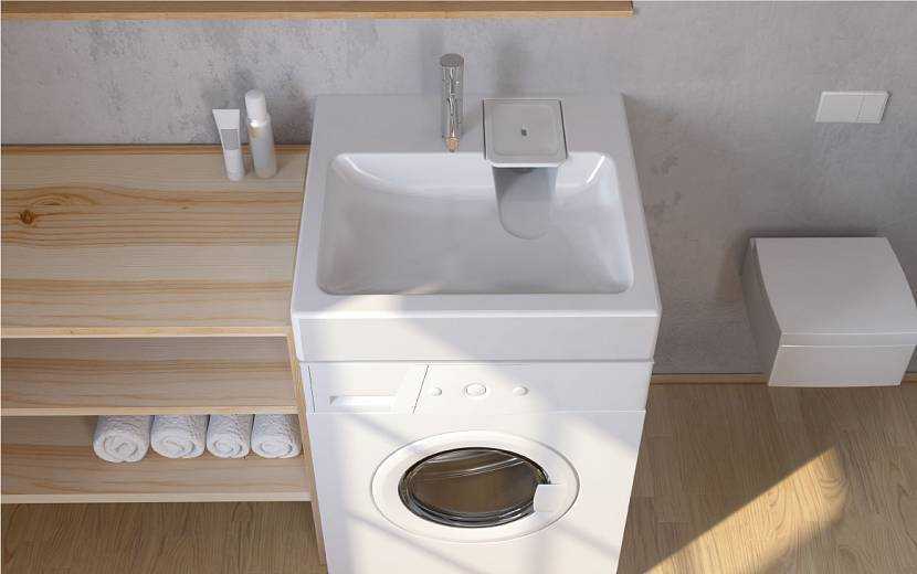 В условиях стеснённого пространства можно использовать умывальники в виде чаши или раковину-кувшинку для установки над стиральной машиной.