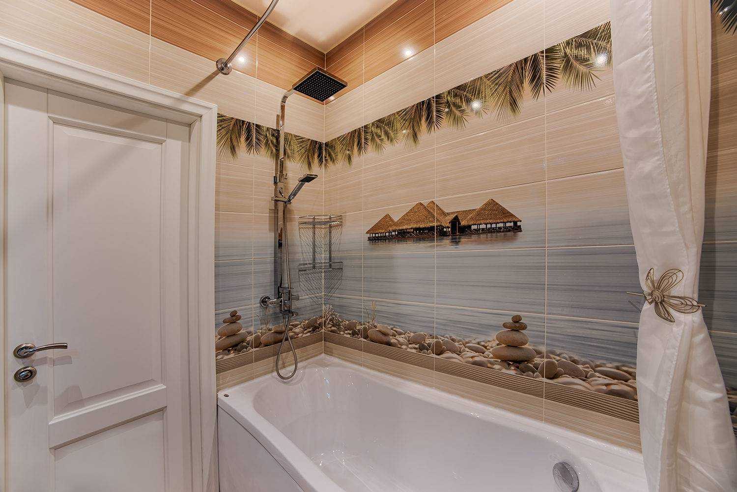 От рисунков и принтов, а также матовых фактур лучше, все-таки, отказаться, однако если совсем уж невмоготу, то выбирать орнамент нужно очень тщательно и дотошно. Крупные картинки точно сюда не пойдут, причем лучше выбрать кафель с вертикальной ориентацией узора, так будет казаться, что комната выше и больше.